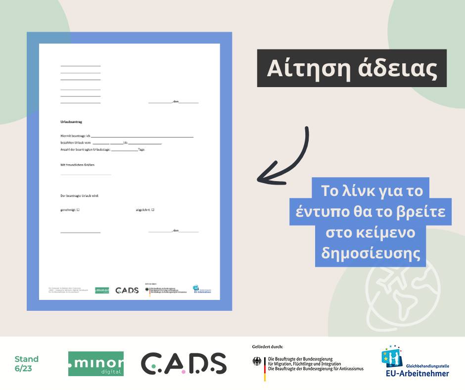 ❗⛱Για να χρησιμοποιήσετε το νόμιμο δικαίωμα αδείας σας, πρέπει να υποβάλετε την αίτηση εκ των προτέρων. Η άδειά σας πρέπει πάντα να εγκρίνεται από τον εργοδότη. Ο εργοδότης έχει τη δυνατότητα να προβεί σε επιμέρους ρυθμίσεις σχετικά με τον χρόνο υποβολής και τη μορφή της αίτησης. Επομένως, είναι σκόπιμο να υποβάλλετε την αίτησή σας όσο το δυνατόν νωρίτερα. Μπορείτε να χρησιμοποιήσετε το υπόδειγμα της αίτησής μας.