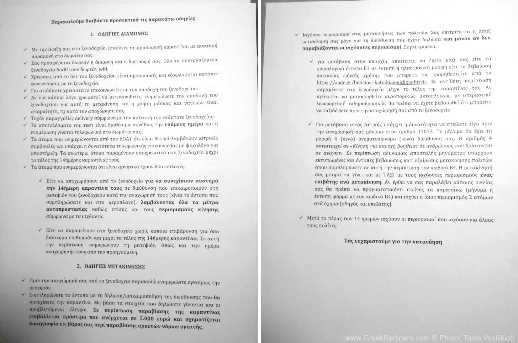 Οπότε αποφάσισα, εφόσον πρέπει να πάω, να το ρισκάρω και αγόρασα το εισιτήριο. Παράλληλα, προσπαθούσα επί ώρες να συνδεθώ πάλι με το Ελληνικό προξενείο στο Βερολίνο. Δύο ώρες αφού αγόρασα το εισιτήριο, τελικά το σήκωσαν και μου εξήγησαν την κατάσταση στην Αθήνα: μου είπαν ότι θα μου κάνουν τεστ μόλις φτάσω Ελλάδα και θα με βάλουν με όλους τους άλλους ταξιδιώτες σε ξενοδοχείο μέχρι να βγουν το αποτελέσματα του τεστ.